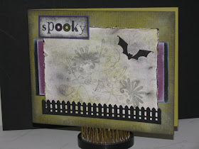 Hello all.....I had time to play today!! So, I decided to take a stab at a challenge. My fellow stamp friend, Barb, has started some fun Halloween challenges on her ALL Halloween blog called Haunted Design House. Well, the first one is called Wicked Thicket. She said "use those pretty spring images and create a little darkness". It was a challenge, I tell ya!! I do like how it turned out!! Certainly wouldn't have used this "flowery" stamp set for Halloween!!! LOTS of sponging with several different colors to get that look on the green cardstock. I got out my shimmer spray for over the flowers......my spray pump stopped working so I just "splattered" it over the flowers and rubbed it in with my fingers. Oh yeah, you have to have jagged edges on a spooky card, right? Got out that old edge distresser and went to town and I didn't even care that the paper tore!! Added to the effect!