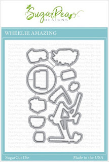 I had so much fun putting this card together using LOTS of SugarPea Designs products. I started by die cutting a cement color cardstock with the Card Front Element Builder SugarCut (scallop edge). Next, I stamped a tone on tone "x" pattern at the bottom using an image from Follow Your Dreams. I stamped, colored, and die cut my various images from Wheelie Amazing and decided placement. I knew I wanted to make this a "LOVE" card in some way so using the Envelope Liner SugarCut, I added a die cut "LOVE" out of red cardstock. To finish the sentiment, a tiny 'xoxo' from You're My Type was stamped in black ink. As final touches, I added a few die cut hearts that were coated in Glossy Accents.